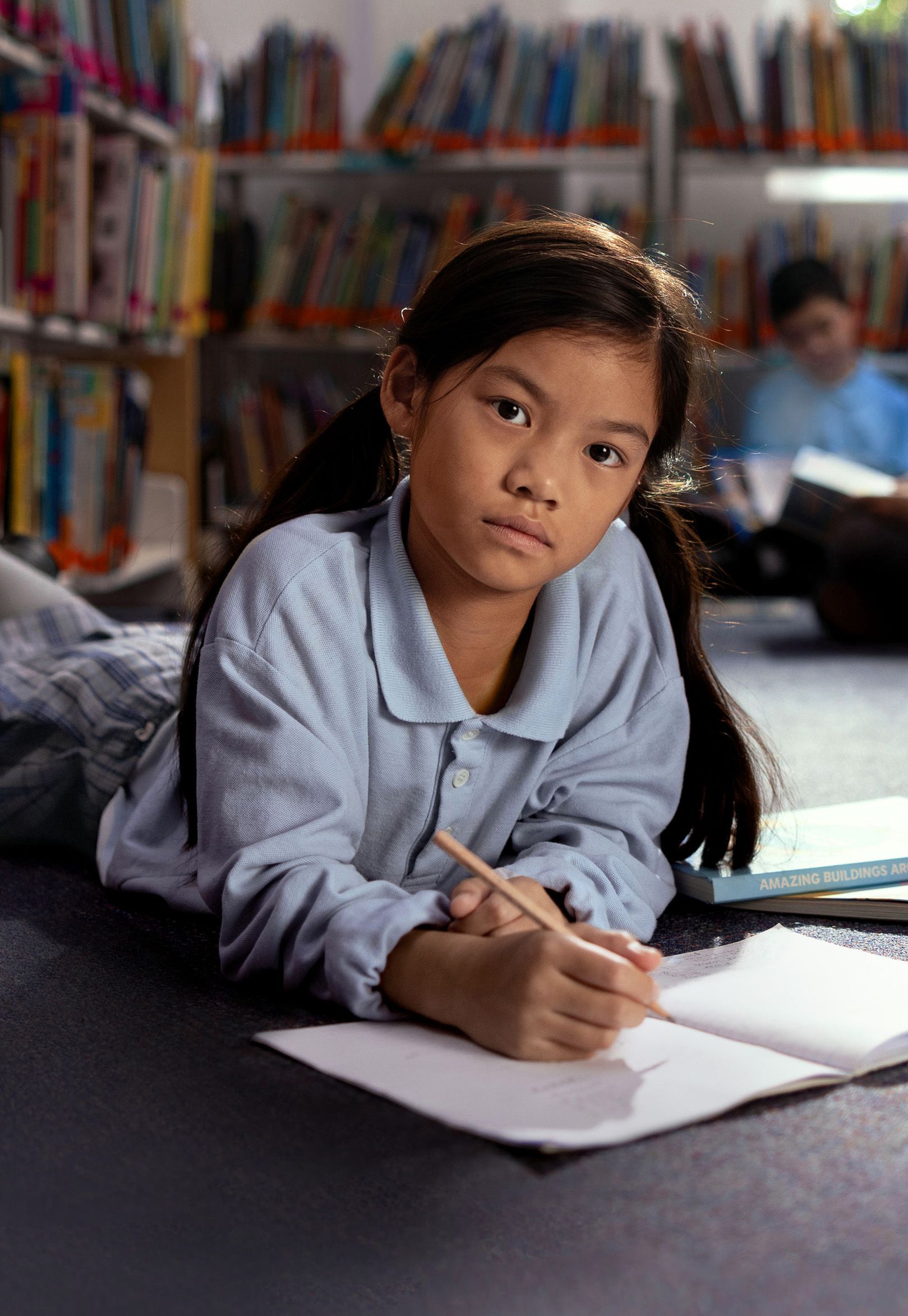 Working on her maths homework on the library floor before school, Leah’s focus is absolute. Her direct gaze communicates a powerful drive to succeed, a determination born perhaps from the challenges hinted at by her worn uniform and scuffed shoes. There’s a quiet strength in her posture, yet a touch of vulnerability suggests she’s still finding her confidence.