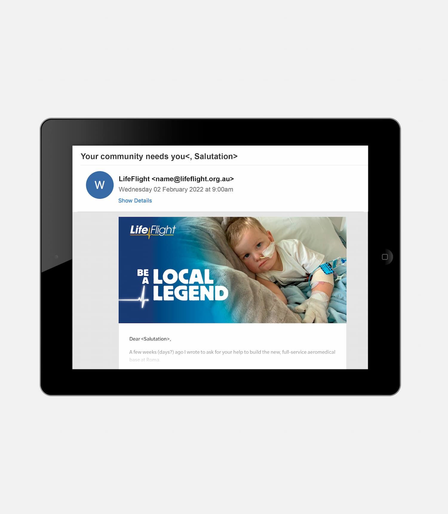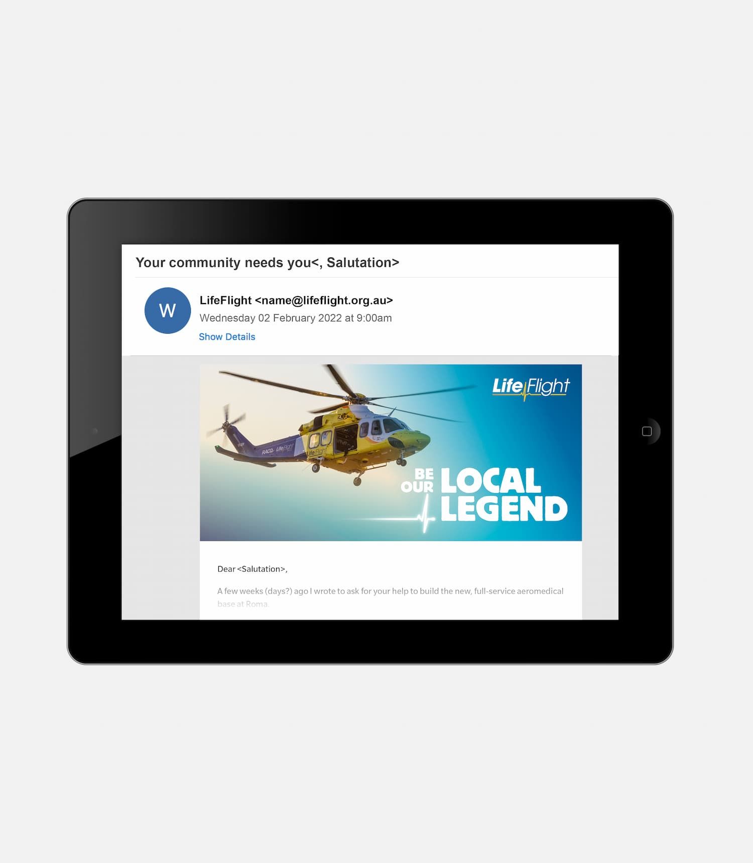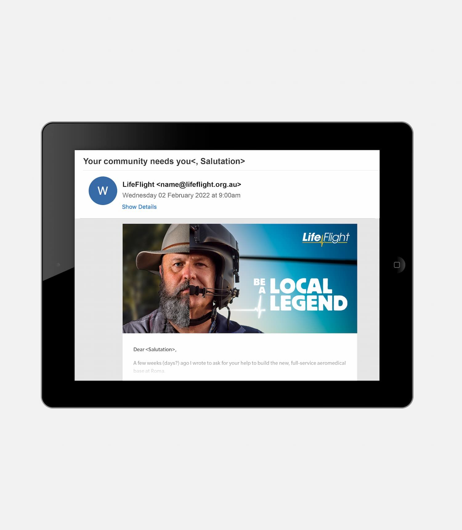 Our multi-channel approach used direct mail and digital channels to tap into LifeFlight’s strong grassroots community support. Tone created a suite of Key Visuals that connected the Maranoa community with the LifeFlight pilots and crew. This visual approach successfully built a strong, engaged group of local supporters who backed the initiative and kickstarted the long-term capital campaign so LifeFlight could deliver life-saving aeromedical and rescue services across the region.