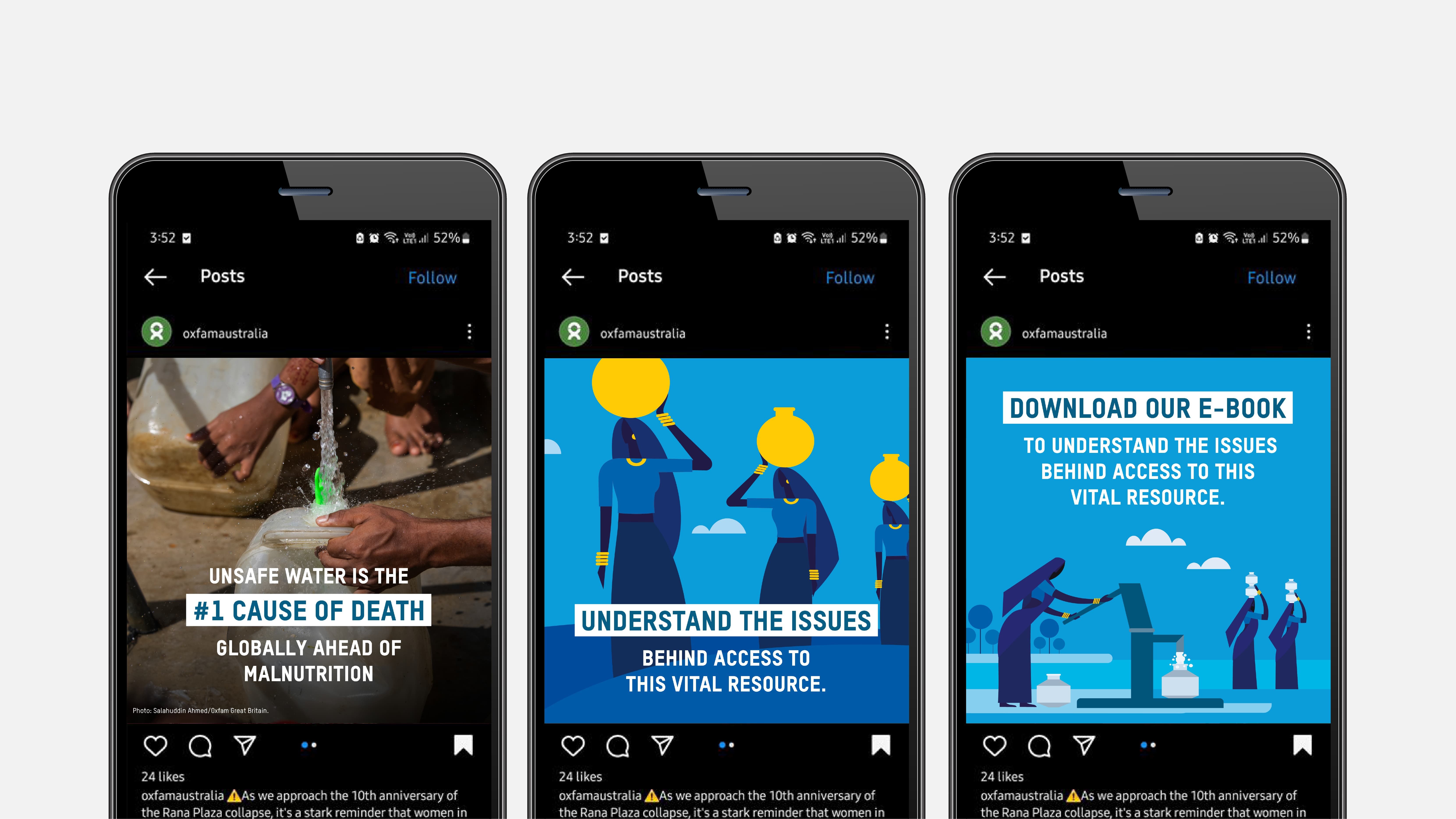 The creative look and feel was inspired by the illustrative approach utilised by the French campaign. Each title was assigned a colour from Oxfam’s signature brand colour palette – blue for WASH, green for Climate change and pink for Fashion. Eye catching and thumb stopping illustrations were developed in these colour palettes to bring each topic to life, and stand out from the largely photographic content on social media. These eye catching illustrations were paired with bold typography and bite sized graphics showcasing statistics. The overall effect was to create multiple access points into the content, allowing readers to easily dip into the topics. Change&Co recrafted the ebook content for a local audience and refined the social media and supporting email messaging for maximum engagement and conversion.
