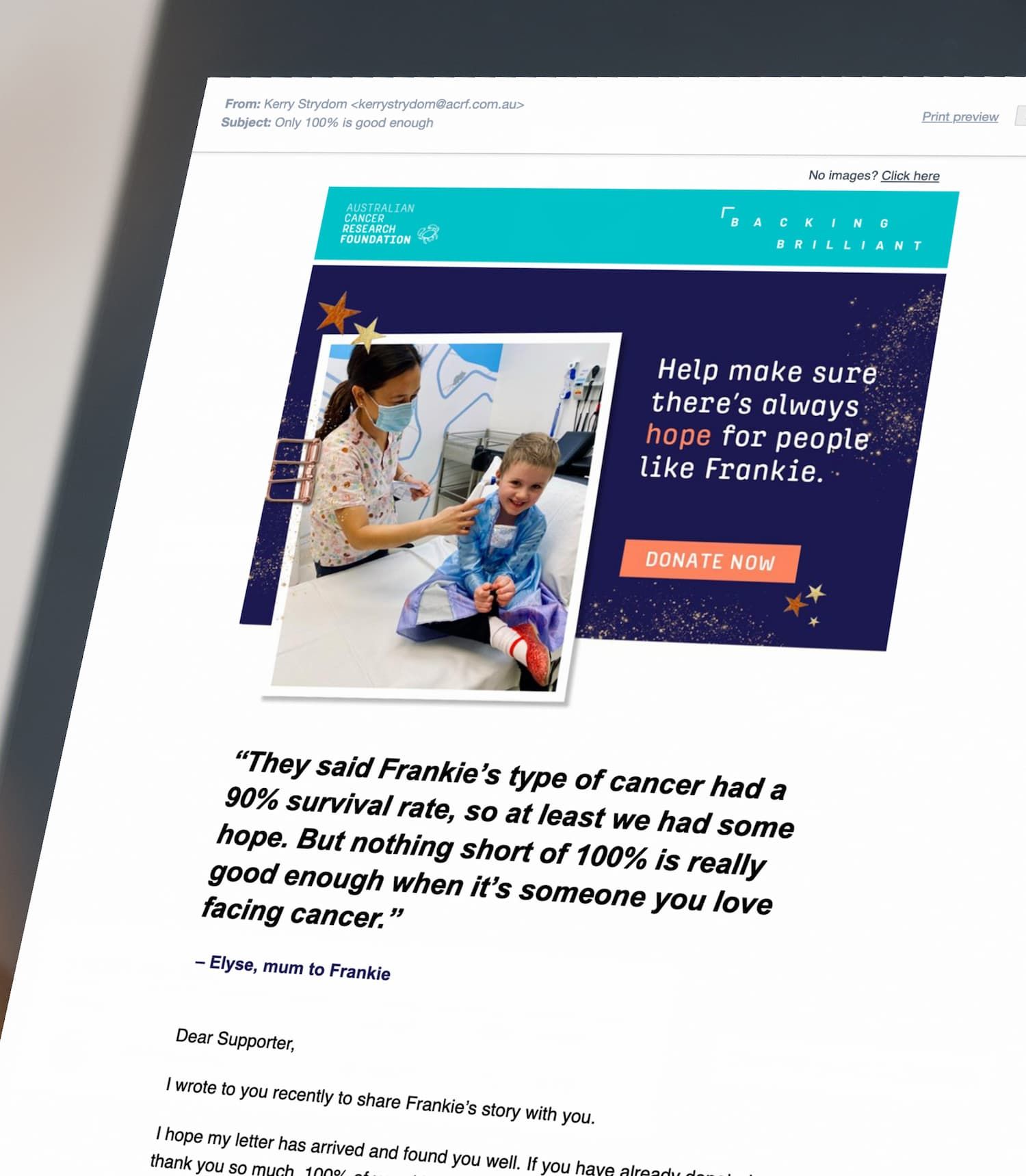 As fundraising communications specialists, we used cutting-edge design and compelling storytelling to produce digital content that not only engaged audiences of existing and potential donors – but converted to clickthrough’s and donations. Our custom landing page design and visual EDM journey brought Frankie’s story to life in an engaging way that was unique to the digital landscape.