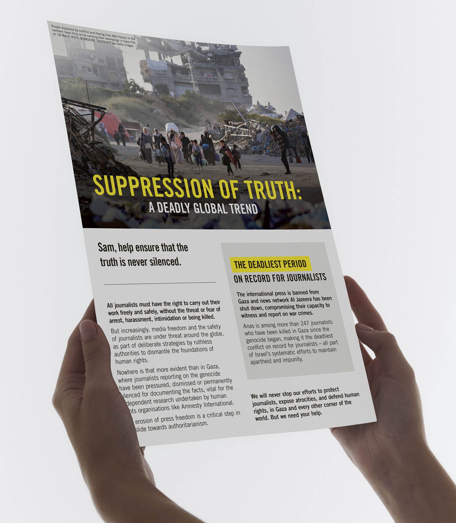 Our team presented a rallying cry to Amnesty supporters, who will not allow journalists to be silenced. Atrocities will not be hidden, nor can abusive authorities commit crimes with impunity. The campaign was a chilling warning. Attacking journalists is often the first step toward wider human rights violations.