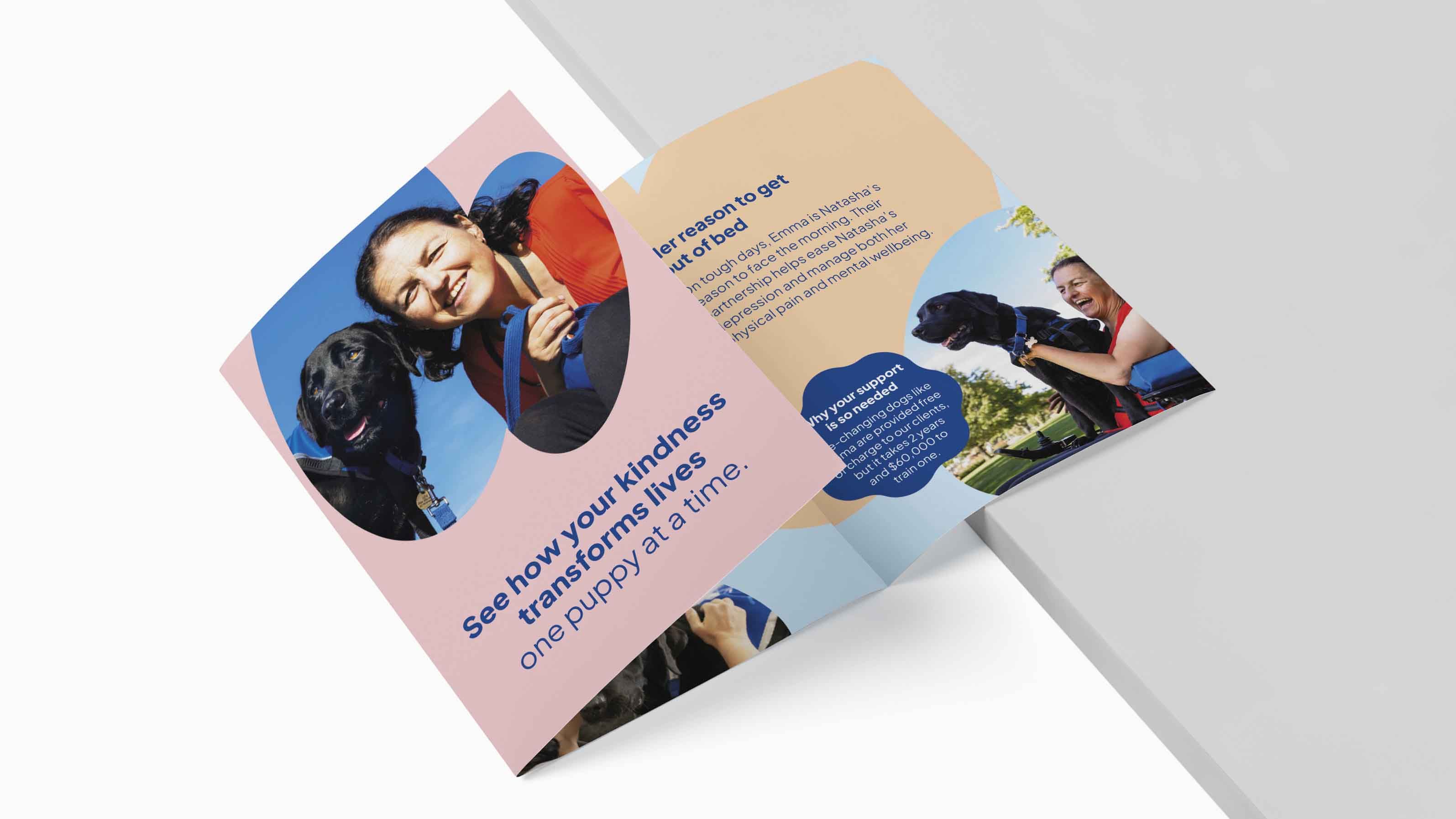 The campaign featured authentic, warm, and emotionally engaging images. Tight crops centred the focus in on the human connections and personalities of the dogs/puppies. An organically shaped graphic device inspired by a paw framed photography, adding a unique and cohesive visual touch.